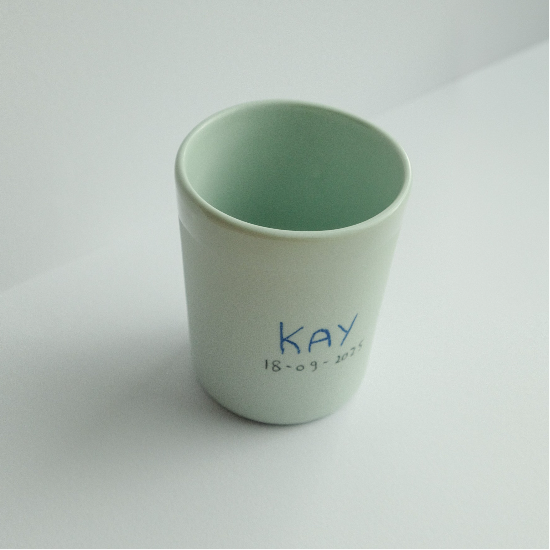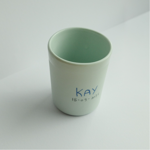 Het gepersonaliseerd mokje is verkrijgbaar met geschreven naam en/ of datum, de gewenste naam en datum vermelden in het notitie vak. Deze worden dan in jou gekozen kleur gegoten en geglazuurd (de binnenkant en een drinkrandje ongeveer 1 cm).